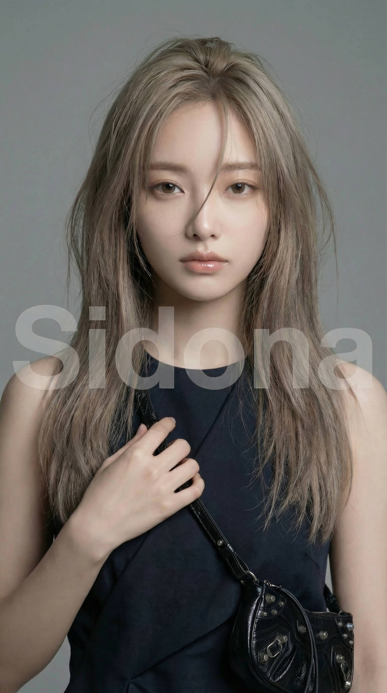 9:16Using the uploaded reference photo of the same person, create a high-fashion editorial studio portrait. Strictly preserve the same facial identity and skin tone. A young woman with long hair styled in a messy, effortless way looks straight into the camera with a weird, cold, and detached expression. Her gaze is calm and distant, slightly unsettling yet elegant. She wears a black oversized blazer layered over an oversized black top. The outfit feels modern, minimal, and intentionally oversized. A loose strand of hair falls naturally across her face, adding subtle elegance and imperfection. One hand gently touches the strap of a Balenciaga stud clutch worn crossbody, treated as a styling accent rather than a focal prop. Soft, diffused studio lighting creates smooth shadows and highlights her natural beauty, glossy lips, and pink-toned makeup. The lighting is cinematic but restrained, with a matte editorial finish. The background is a plain grey studio backdrop, clean and distraction-free. Camera framing is a medium portrait at eye level, with sharp focus on the face. The overall aesthetic is elegant, modern, weird, and high-fashion editorial. Place a large, transparent, see-through word “xxx” floating in front of the model, subtle and editorial, without blocking facial features. Ultra high resolution, photorealistic, editorial quality, 8K.