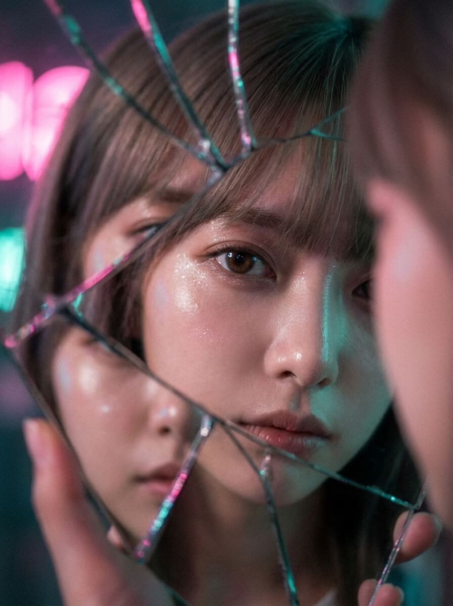 3:4A cinematic close-up portrait capturing the specified woman through a fragmented mirror placed in front of her face. Shot with a 50mm lens at f/1.4 to achieve an extreme bokeh effect, her facial features are multiplied and distorted in the shards of the mirror, creating a surreal kaleidoscope effect. However, only one of her eyes is sharply in focus, staring directly at the lens with a piercing gaze. Neon pink and teal lights reflect off the glass, adding a glow of modern aesthetics. The atmosphere is melancholic yet futuristic, infused with an editorial spirit, featuring glossy highlights and soft cinematic shadows. Subtle digital grain and color grading elevate it to a dreamlike yet fashion-driven aesthetic, making it a perfect finish for cutting-edge campaigns.