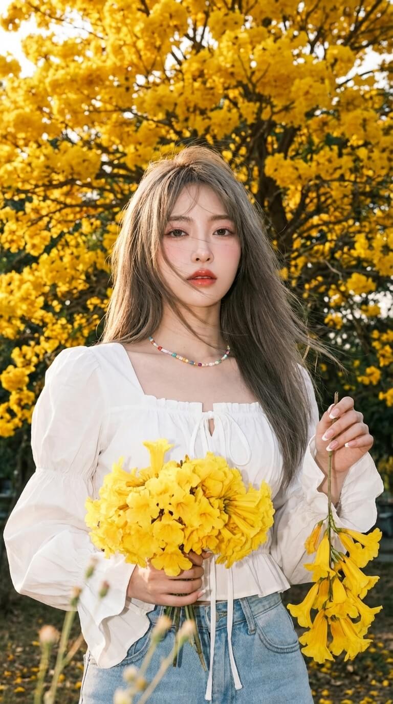 3:4Use reference image. Preserve identity and facial structure strictly. A slim Asian woman standing still, body deliberately composed rather than casual. Her posture feels arranged and intentional, not relaxed. She faces the camera directly, shoulders stable, center of gravity controlled. Her expression is calm and restrained — not playful, not overly sweet. A controlled, subtle smile, with emotional distance. Her gaze is steady and aware, fixed toward the camera, creating quiet dominance rather than friendliness. Hands & Props Right hand holding a hanging cluster of golden trumpet flowers, positioned deliberately as a visual accent Left hand holding a larger bouquet of golden trumpet flowers, lowered slightly Flowers function as props only, never overpowering the subject The woman remains the absolute visual focal point at all times Hair Long hair, slightly messy layered style Hair gently lifted by wind, with a few loose strands crossing the face Chic, slightly sexy, but controlled — never messy or cute Outfit White vintage-style puff-sleeve blouse Large puffed sleeves Layered ruffle cuffs Square neckline Drawstrings at the chest forming soft gathers Slightly long length covering the hips Front slit visible but restrained Light blue jeans Colorful beaded necklace as a subtle accent Makeup Fair skin tone Douyin + Korean beauty inspired Long curled eyelashes Soft pink blush on cheeks and nose tip Glossy pink-orange lips with juicy shine Makeup feels polished and deliberate, not cute Nails White French tip nails Subtle Christmas-themed nail art, low contrast Environment Standing directly in front of a fully blooming Golden Trumpet Tree (Thong Urai) The tree is dense with bright golden flowers, forming a saturated backdrop Some flower stems partially overlap the top edge of the frame, creating a soft foreground blur Background exists to frame the subject, not to compete with her Lighting (CRITICAL) Direct flash is the dominant key light Flash visibly overpowers ambient light Skin appears very bright with slight yellow flash tone Clear, hard-edged shadow cast behind the subject Natural sunlight exists only as weak ambient fill Lighting creates strong separation between subject and background Photography Style Compact camera aesthetic Fujifilm Pro 400H film look Vintage lens character Subtle film grain Ultra-sharp subject clarity Bright exposure with aggressive subject emphasis 8K resolution The image feels intentional, staged, and directed — not casual or spontaneous