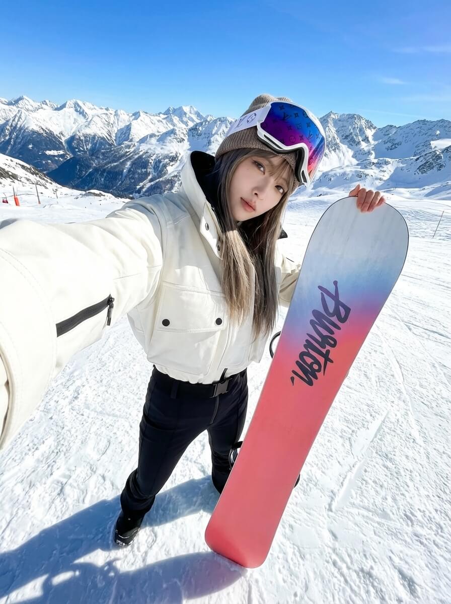 3:4Create a high-fashion winter ski portrait based on the uploaded person photo. IDENTITY: - The face, hairstyle, and body proportions must closely match the uploaded image - Keep the subject realistic and recognizable SCENE: - snowy ski resort - open mountain background - clear blue sky - bright daylight - no crowd POSE (CRITICAL): - auto-generated within fashion pose constraints - relaxed, playful, and natural posture - no action or riding movement CAMERA: - ultra low-angle shot - camera placed very close to the snow surface - wide-angle lens - exaggerated perspective - foreground snow and boots appear large COMPOSITION: - subject leaning slightly toward the camera - long-leg visual emphasis - snowboard partially in the frame, tall and dominant STYLE: - fashion ski photography - playful, confident, lifestyle-focused - not action sports - editorial winter look LIGHTING: - strong natural sunlight - crisp shadows - high contrast between subject and sky